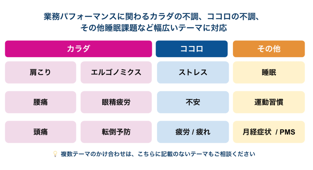 肩こり、腰痛、眼精疲労など、日常のちょっとした不調をご相談いただけます。「病院にかかるほどではない・相談するほどではない思っている」といった場合でも、「AI姿勢検診」の結果データを見ながらセラピストが会話の中で自然に日々のお悩みを引き出し、改善のアドバイスへと繋げます。