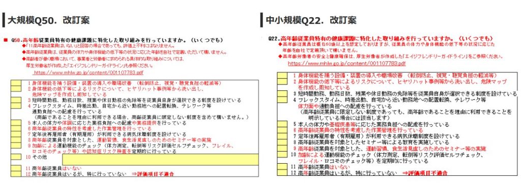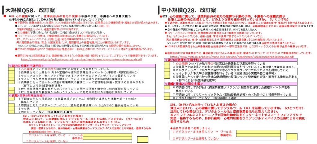 「メンタルヘルス不調者への対応」の項目名が、よりポジティブな「心の健康保持・増進に関する取り組み」へと変更されました。評価項⽬名の変更に併せ、設問・選択肢を修正されています。