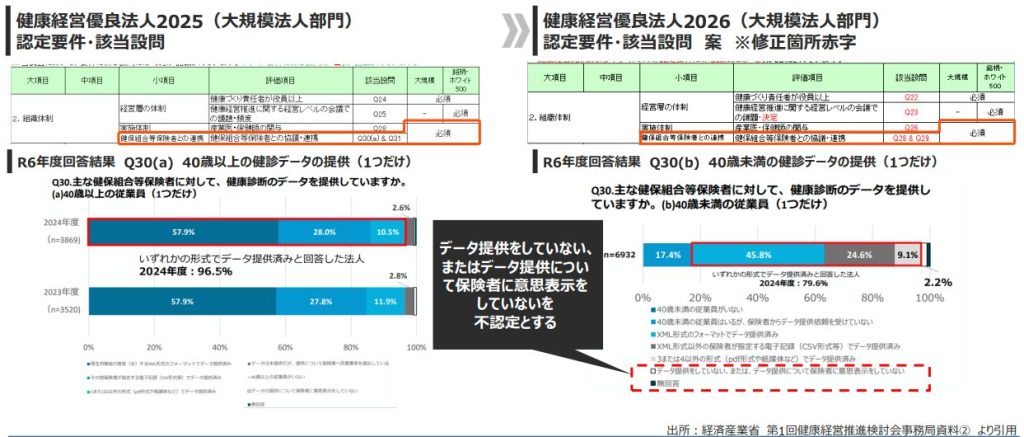 健康保険組合等保険者への健診データ提供に関して、40歳以上の従業員のデータ提供が誓約事項へ移行し、40歳未満の従業員のデータ提供が必須要件となりました。
