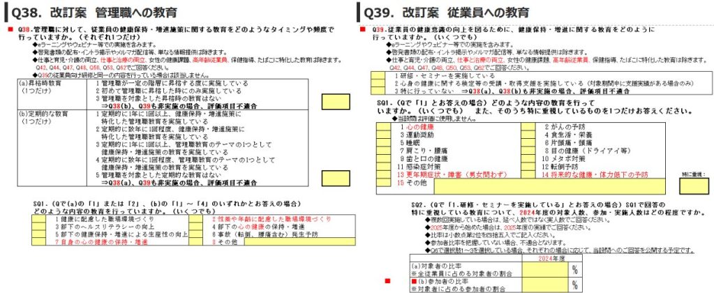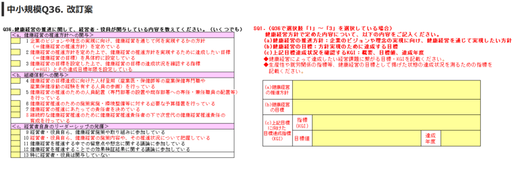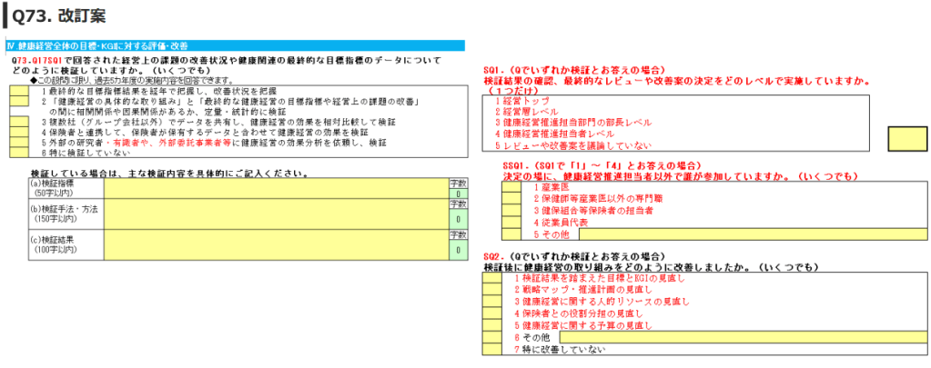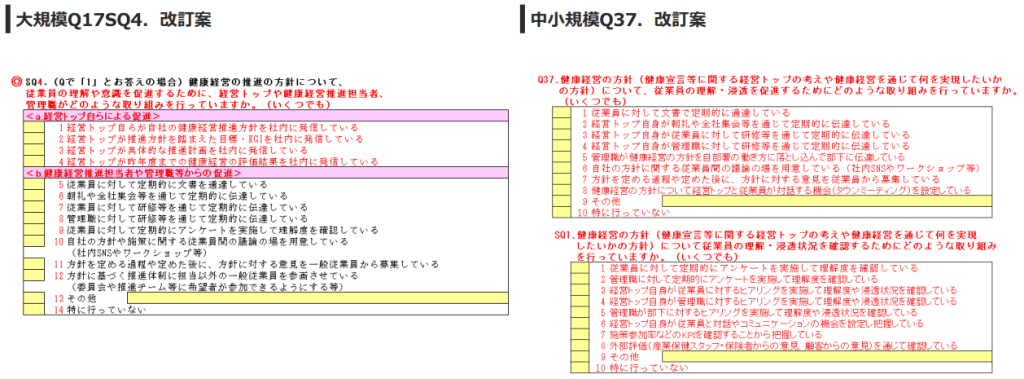 「健康経営ガイドブック」の定義に基づき、設問と選択肢が改訂され、企業全体の目標・KGI検証への関与者を確認する設問が追加されました。