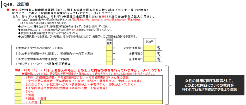 また、女性の健康課題に関する教育として、どのような内容に取り組まれているかが確認できるようSQが新設されています。