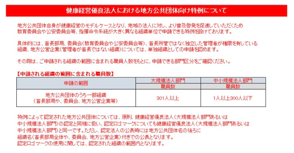 今年度より、自治体(地方公共団体)は、首長部局だけでなく、教育委員会や公安委員会など、指揮命令系統が異なる各種委員会単位での申請が認められるようになりました。これは、地方公共団体が地域における健康経営のモデルケースとなり、普及啓発を促進するための一環です。