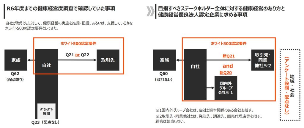 「健康経営優良法人(大規模法人部門)ホワイト500」の認定要件として、国内外のグループ会社への健康経営推進方針の浸透状況と(Q20)、取引先・他社への健康経営支援に関する設問(Q21)が必須(and条件)となりました。また、地域・社会に対する健康経営の普及状況に関するアンケート設問も追加されました。