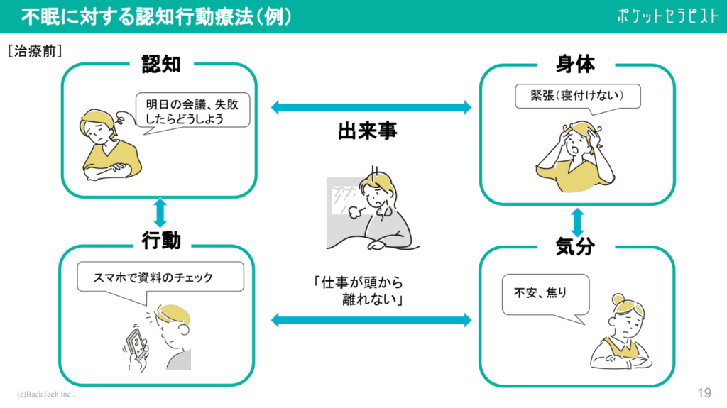 そして「2. 不眠に対する認知行動療法(CBT-I)のご紹介」のセッションでは、医学的にも効果が認められている認知行動療法(CBT-I)について説明し、不眠の背景にある思考や行動習慣に着目した改善方法についての概要をご紹介しました。