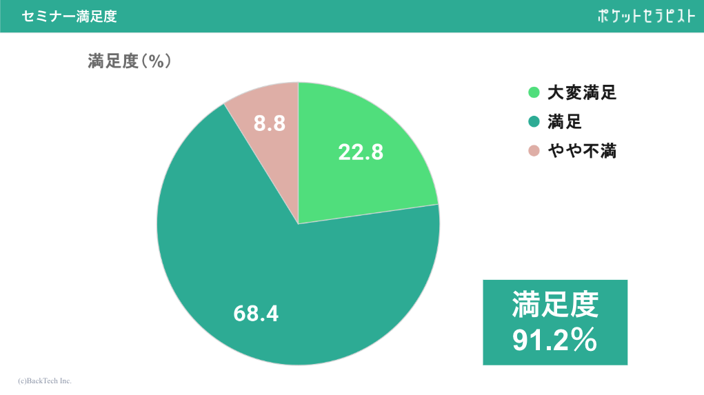 アンケートでは、約80%の方がご自身の睡眠課題の改善を目的として参加したと回答されており、中にはご家族や同僚などの身近な人の睡眠の悩みのためにご参加された方もいらっしゃいました。セミナー後のアンケートでは、実践的な内容や医学的根拠のある内容についてなどの評価が高く、91.2%の方からセミナーに満足したと回答いただきました。